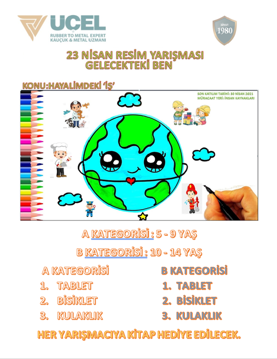 Üçel Çalışanlarımızın çocukları için Resim Yarışması etkinliği düzenliyoruz. Yaptığı resimle katılım gösteren Üçel çalışanlarının 5-14 yaş arası çocuklarına hediyeler göndererek 23 Nisan etkinliğimizi kutluyoruz.
